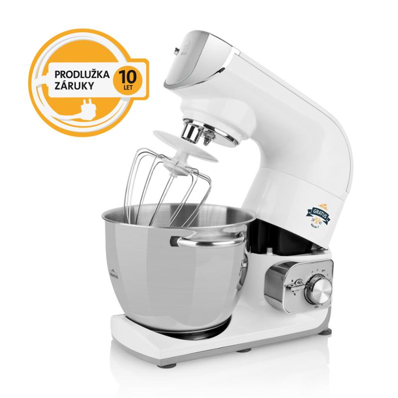 Disponuje planetárním systém míchání, který kvalitněji a systematičtěji zpracovává obsah nádoby a dokonale tak připraví těsto pro všechny vaše dobroty během chvilky. K tomu přispívá i prodloužená část šlehacího nástavce, která zachytí suroviny až u stěn nerezové mísy a zpracuje tak celý obsah nádoby.