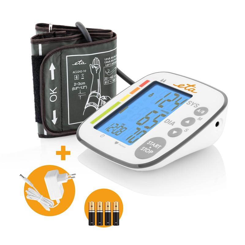 Díky tlakoměru na paži ETA 3297 90000 a praktickému adaptéru budete mít přehled o svém zdravotním stavu i případných zdravotních komplikacích. Pro maximální pohodlí během měření nabízí nastavitelný obvod manžety délku 22–42 cm. Tlakoměr ETA je určen pro použití v pohodlí domova, kde profesionálně změří váš systolický i diastolický tlak oscilometrickou metodou s přesností ± 3 mmHg. Přístroj monitoruje také puls, na jehož případnou nepravidelnost, tedy arytmii, vás okamžitě upozorní. Tlakoměr ETA pro provoz využívá 4 ks AAA baterií a lze použít také síťový adaptér. Pro úsporu baterií se tlakoměr po minutě nečinnosti automaticky vypne.
