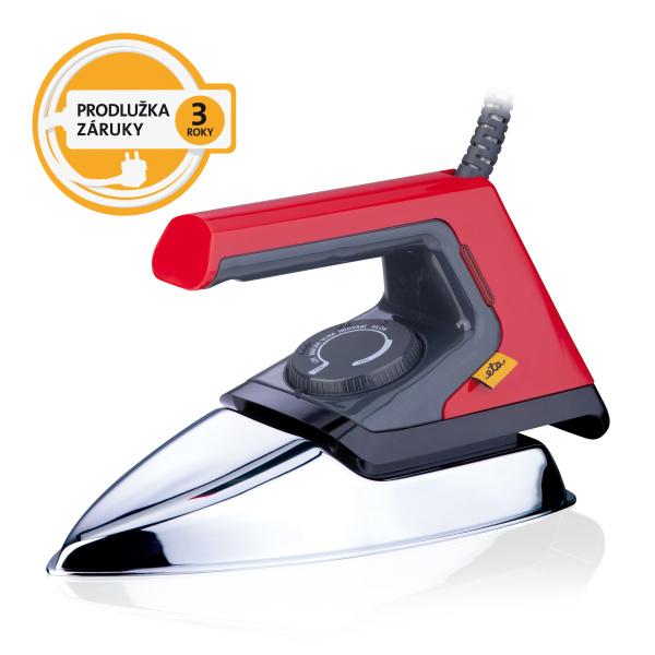 Suchá retro žehlička v nevšedním červeno-černém provedení, s nerezovou žehlicí plochou, plynulou regulací teploty, otevřenou rukojetí a tříletou zárukou.