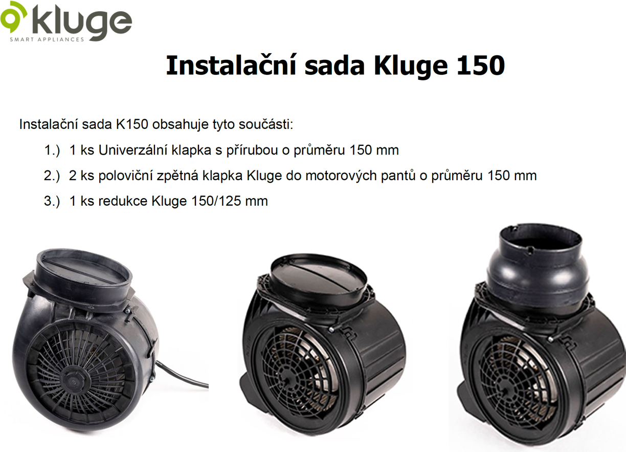 Doplnění kuchyňských odsavačů Kluge dalšími vzduchotechnickými prvky pro instalaci do odtahu. Sada není schopna nahradit řádnou vzduchotechnickou instalaci, nicméně je možno ji úspěšně použít ve specifikovaných případech.