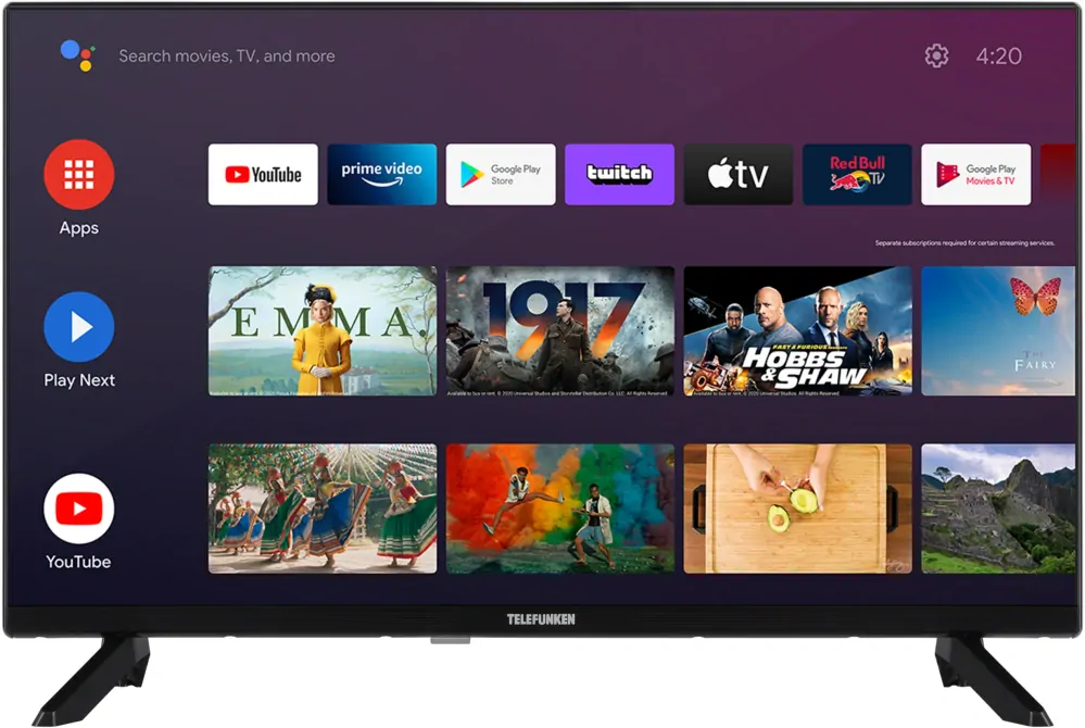 Smart televize Telefunken 32TLFA7550 se systémem Android TV s uhlopříčkou 80 cm, 32", FULL HD LED TV, DVB-T2/C/S2, rozlišení 1920x1080px, jas 250cd/m2, s pamětí pro 12.200 (analog + digital) programů, s podporou aplikací mimo jiné KODI, O2 TV, Chromecast, Google Play, HDR, H.265/HEVC, CI+, LAN, WiFi, Bluetooth, HbbTV, Toptext/Fasttext 1.000 stránek, Stereo sound system 2x 6 W German+Nicam Stereo, 3-D Comb Filter, Mody obrazovky: Standard, Vivid, Sport, Movie a Game. 2x HDMI, 1x USB, 1x konektor pro sluchátka, Sleep timer, On/Off timer, Switch off timer, funkce vypnutí obrazu, automatické vypnutí bez signálu, VESA 75x75, rozměry s podstavcem (VxŠxH): 48,1 x 72,8 x 16,7 cm, rozměry bez podstavce (VxŠxH): 43 x 72,8 x 7,6 cm